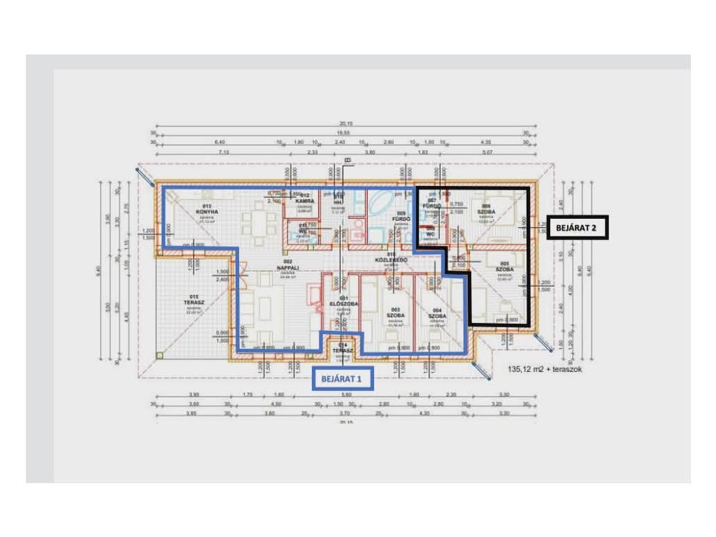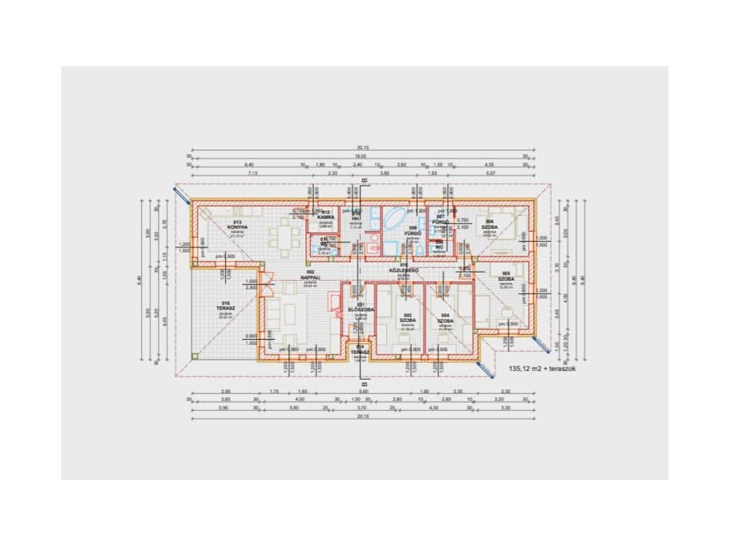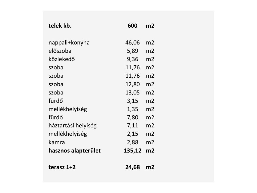 Nettó 135 m2 lakóterület, 22 m2-es fedett terasz. A telekrész 860 m2.